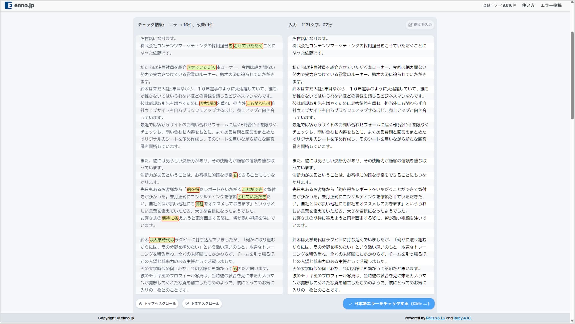 チェック前後の文章が横並びで表示されるため、見比べながらの修正作業もスムーズに進められます。